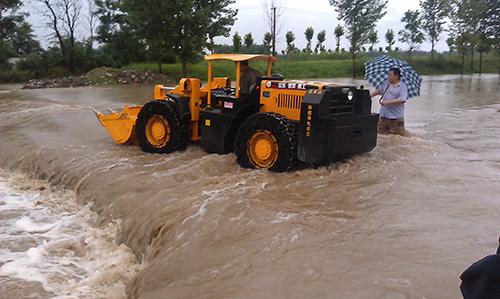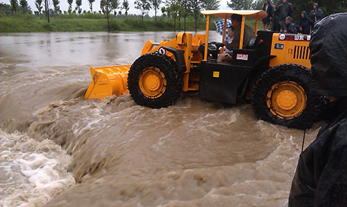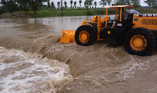 銀澤小霸王立即投入到抗洪救災之中,主要負責物資的運輸、修復受損路段,以及鏟裝砂石料裝入運輸車輛等工作。在大坡度的防洪大堤面前、面對著濤濤江水,裝載機沒有打怵、機手更沒有害怕;銀澤小霸王將一條條裝滿砂石的防洪編織袋投入滾滾的江水之中,成為抗洪搶險中的金剛!